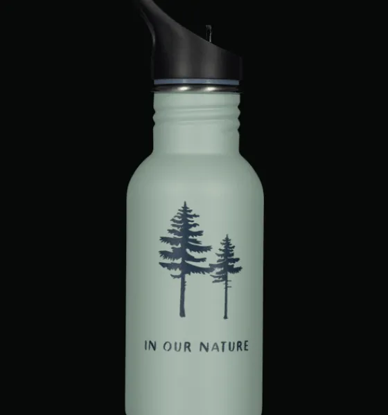 Vattenflaska tillverkad i rostfritt stål. Flaskan är försedd med praktisk ögla som kan användas för fastsättning med exempelvis en karbinhake eller bara för att bära den med ett finger.
