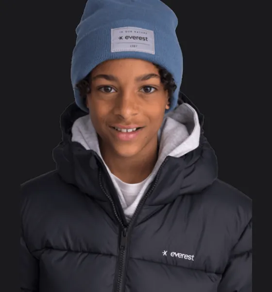 Stickad mössa i akryl. Ett uppvik nedtill gör den dubbelt så tjock över öronen för ökad värme. Den är dessutom försedd med ett reflekterande Everest-märke framtill.