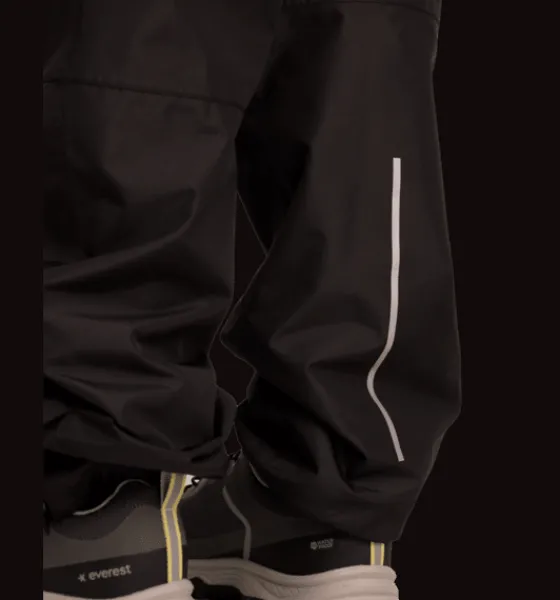Everest J Allround Pants är regnbyxor för barn. De har vind- och vattentätt yttertyg, bra andasfunktion och tejpade sömmar för en helt vattentät konstruktion. Byxorna har mjukt innerfoder, men är ovadderade. De är justerbara i midjan för bästa passform och har förböjda knän för bättre rörlighet. Byxorna har också elastiska benslut för att hålla vind och regn ute. De är dessutom utrustade med en reflekterande detalj baktill på byxbenet. Byxornas ytbehandling är fri från miljöfarliga fluorkarboner och innerfodret är färgat med energibesparande Solution Dye-teknik. För svart färgställning har även yttertyget blivit infärgat med denna teknik.