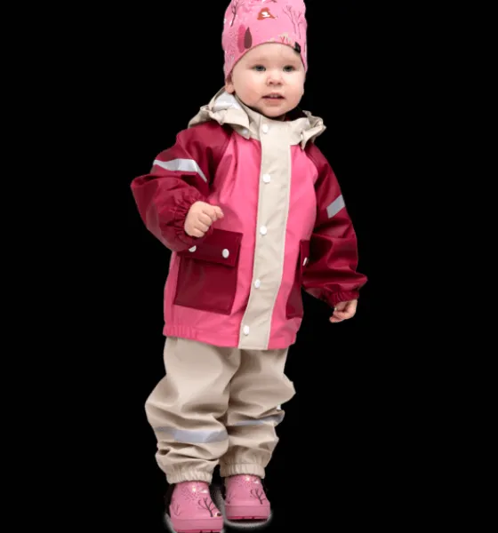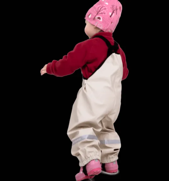 Regnbyxor för barn, gjorda i PU-material och med svetsade sömmar för en helt vattentät konstruktion. Byxorna är justerbara i midjan och har justerbara hängslen för en riktigt bra passform. De har även justerbara, elastiska band som träs under skorna eller stövlarna för att hålla byxbenen på plats och för att hindra vatten från att komma in. Plaggets ytbehandling är fri från miljöfarliga fluorkarboner. Byxorna kan lätt spolas av eller torkas rena med en trasa.
