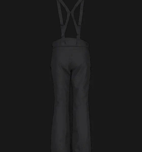 Vadderade skidbyxor med vattentätt yttertyg som även ger effektiv andasfunktion. Alla sömmar på byxorna är tejpade för att ge ett så bra skydd som möjligt mot regn och snö. De har insida med fleece baktill och material med låg friktion framtill för att ge bra värme och för att vara smidiga att komma i och ur. Snölås i bensluten håller snö och kyla ute. Bensluten är dessutom förstärkta på insidan för att bättre stå emot slitage från skidornas vassa stålkanter. Byxorna har också avtagbara hängslen, elastiskt justerbart band i midjan och hällor för bälte. Plagget är fritt från miljöfarliga fluorkarboner och har yttertyg och vaddering i återvunnet material.