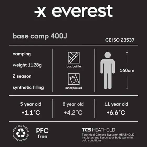 Tvåsäsongssovsäck för juniorer med en kroppslängd på upp till 160 centimeter. Den har en värmande syntetfyllning, Spinloft Cloud, som består av 100% återvunnen polyester. Fyllningens kanaler har bafflar för att minska risken för köldbryggor och för att säkra optimal isolering. Sovsäckens tvåvägs dragkedja från SBS går att öppna och stänga både från insidan och utsidan. Dragkedjan gör det också möjligt att bara öppna upp sovsäcken nere vid fötterna, perfekt om man blir varm. Huvan på sovsäcken är justerbar och det finns även en köldkrage för att behålla värmen inuti sovsäcken. På insidan vid bröstet finns en praktisk förvaringsficka med dragkedja, perfekt för mobilen eller andra värdesaker. Sovsäcken är temperaturtestad enligt den amerikanska standarden ASTM F1720 då ISO-standarden inte går att tillämpa på juniorsovsäckar. Den amerikanska standarden anger komforttemperatur för barn i olika åldrar. En kompressionspåse medföljer. Tänk på att förvara sovsäcken luftigt när den inte används.