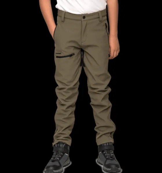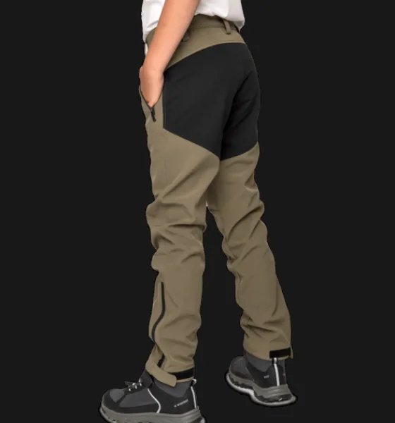 Funktionsbyxor i slitstarkt, stretchigt softshell-material med mjuk och värmande fleece på insidan. De passar bra att använda som friluftsbyxor/vandringsbyxor under kyliga höstdagar. Byxorna har knapphålsresår i midjan för justerbar passform och hällor för bälte. De är förstärkta med vattenavvisande material vid rumpan för att bättre tåla tuffa utomhusäventyr. Byxorna har också tre fickor med dragkedja och förböjda knän för bättre rörlighet. Bensluten går att justera med kardborre och har också en dragkedja i sidan för enklare på- och avtagning. Plagget är fritt från miljöfarliga fluorkarboner.