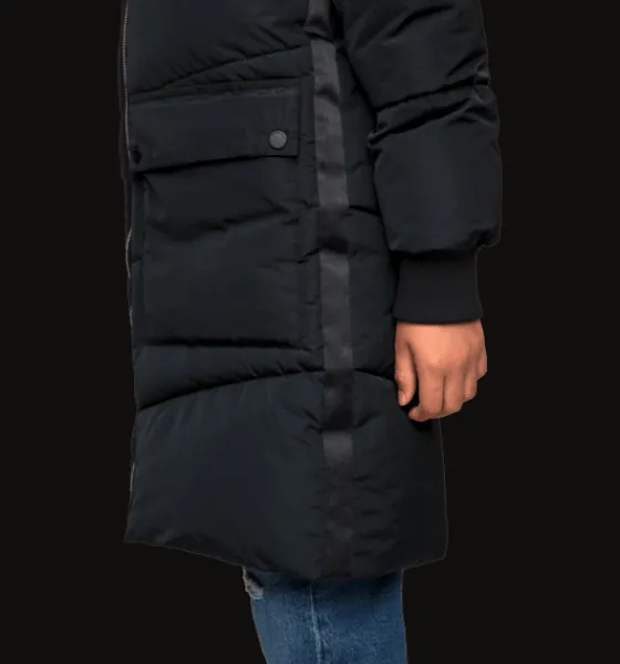 J Minifina Coat från Everest är en varmfodrad, vind- och vattenavvisande juniorjacka i rak, längre modell. Den har värmande vaddering av återvunnen polyester, avtagbar huva och mjukt borstad trikå på insidan av kragen för en varmare känsla. Den är också försedd med stora ytterfickor med ficklock och med en praktisk utvikbar kant i reflekterande material. Plaggets ytbehandling är fri från miljöfarliga fluorkarboner och innerfodret är färgat med energibesparande Solution Dye-teknik.