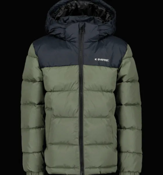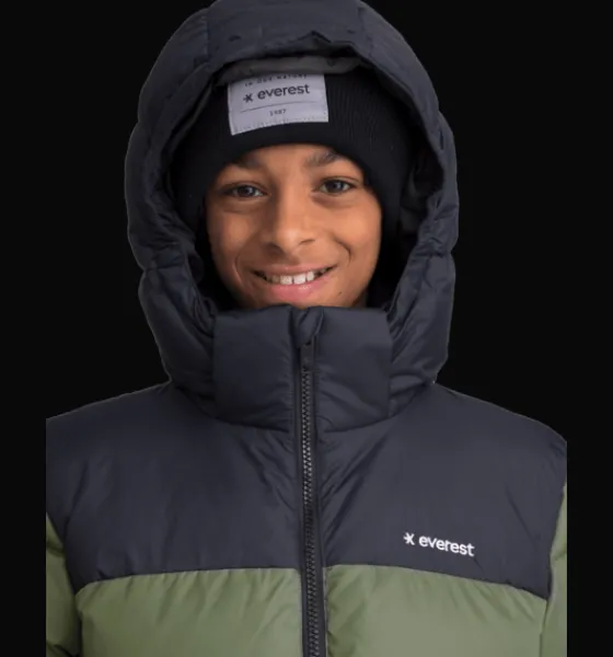 J Yazz Jacket från Everest är en varmfodrad juniorjacka med vind- och vattenavvisande yttertyg och avtagbar huva. Den har en rak passform, värmande vaddering av återvunnen polyester och framfickor med dragkedja. Jackan är också försedd med en reflekterande detalj nertill på ryggen och med mjukt borstad trikå på insidan av kragen för en varmare känsla. Plaggets ytbehandling är fri från miljöfarliga fluorkarboner och innerfodret är färgat med energibesparande Solution Dye-teknik.