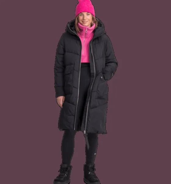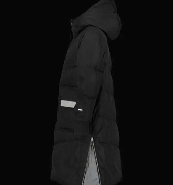 Lång kanalsydd kappa med värmande, dunliknande syntetvaddering av återvunnet material. Den har tvåvägs dragkedja fram och på insidan finns en elastisk bärrem som gör att jackan kan hängas på ryggen som en ryggsäck. Perfekt när det blir för varmt att ha den på sig, om du till exempel är på stan och växlar mellan att vara inne och ute. Bärremmen är avtagbar och kan kopplas bort. Jackan har också sprund nertill i sidorna som kan öppnas upp med dragkedja. Smidigt om du vill öka vidden på jackan så att du kan röra dig lättare om du är ute på en snabb promenad eller kliver i och ur bilen. Inuti sprundet sitter en kil i reflekterande material. Jackan har dessutom praktiska framfickor som har öppningar både i sidorna och upptill. Innanför ficklocket sitter en fastsydd reflekterande detalj som du enkelt kan fälla ut vid behov. Fickorna har också ett mjukt innerfoder i borstad trikå, för en varm och skön känsla när du värmer händerna. Jackan är 3-i-1 kompatibel. Ett fäste bak i nacken gör att du kan koppla ihop en tunnare lättviktsjacka med den här höst- och vinterjackan. På så sätt kan du skapa kombinationer av plagg som du kan använda under en längre del av säsongen.