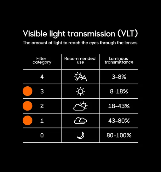 - Lins: Photochromatic är en lins som automatiskt anpassar sig efter mängden inkommande ljus. Linsen är ett riktigt bra allroundalternativ då den kan reglera ljusgenomsläppet från kategori 1-3 och har ett anpassat ljusgenomsläpp på hela 8-80%. Den är även försedd med en Revo-coating.