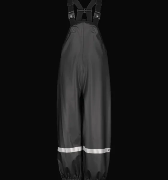 Regnbyxor för barn, gjorda i PU-material och med svetsade sömmar för en helt vattentät konstruktion. Byxorna är justerbara i midjan och har justerbara hängslen för en riktigt bra passform. De har även justerbara, elastiska band som träs under skorna eller stövlarna för att hålla byxbenen på plats och för att hindra vatten från att komma in. Plaggets ytbehandling är fri från miljöfarliga fluorkarboner. Byxorna kan lätt spolas av eller torkas rena med en trasa.
