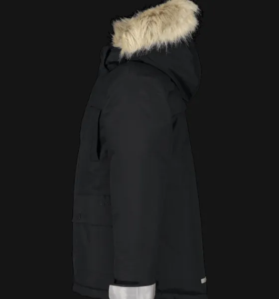 Varmfodrad, vind- och vattenavvisande juniorjacka med värmande, dunliknande vaddering av återvunnen polyester. Jackan har en avtagbar huva med löstagbar syntetpäls och dubbel vindslå vid dragkedjan för att hindra vind och kyla att tränga in. Den är justerbar i både midja och ärmslut för bästa passform, och har reflekterande detaljer vid rygg och ärmslut. Ärmarna har dessutom en invändig elastisk mudd för att skydda mot snö och kyla. Jackan är även försedd med stora, rymliga fickor med mjukt innerfoder, och med ett mjukt foder på insidan av kragen för en varmare, skönare känsla. Jackans ytbehandling är fri från miljöfarliga fluorkarboner och innerfodret är färgat med energibesparande Solution Dye-teknik.