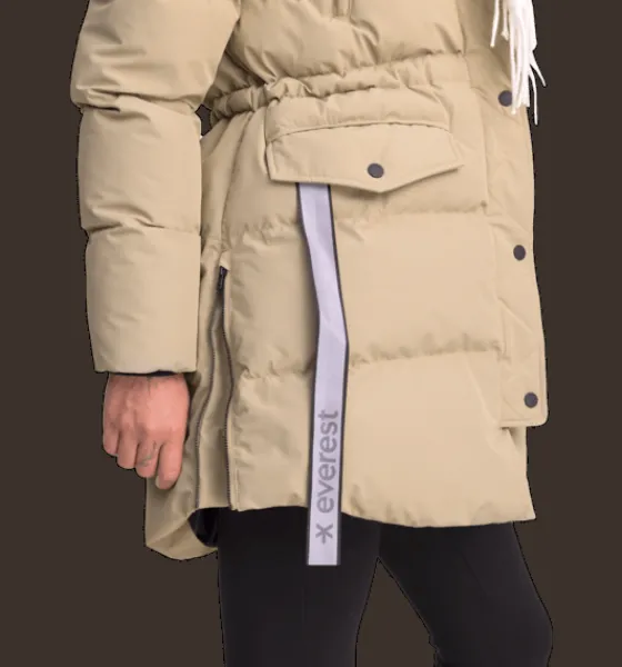 Warm Parka från Everest är en kanalsydd, puffig parka med värmande TCS Insuloft, en syntetvaddering i 100% återvunnen polyester med dunliknande egenskaper. Den har ett yttertyg som är vind- och vattentätt men har inte tejpade sömmar så se upp med för hård, långvarig nederbörd. Jackan har en skönt värmande huva och är justerbar i midjan så att du kan variera din stil – antingen en rakare eller mera timglasformad siluett. Jackan är också försedd med tvåvägs dragkedja fram och med sprund med dragkedja nertill i sidorna, perfekt att öppna upp för en vidare passform så att du kan röra dig lättare om du är ute på en snabb promenad eller kliver i och ur bilen. Det finns också en skyddande vindslå både framför och innanför dragkedjan fram. Den hindrar vind och kyla från att tränga igenom samtidigt som den skyddar plaggen under jackan från att fastna i dragkedjan. Jackan har även elastiska innermuddar i ärmsluten samt flera praktiska fickor. Sidofickorna har mjuk borstad trikå på insidan för en varmare känsla. Inuti ena fickan finns dessutom ett band med reflekterande tryck, smidigt att fälla ut vid behov. Parkan är 3-i-1 kompatibel. Ett fäste bak i nacken gör att du kan koppla ihop en tunnare lättviktsjacka eller väst under den här jackan. På så sätt kan du skapa kombinationer av plagg som du kan använda under en längre del av säsongen.